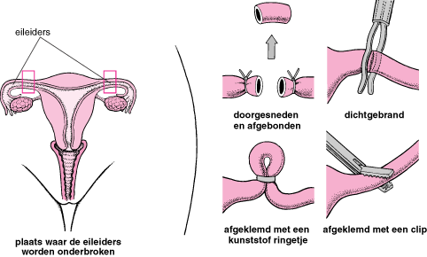 Bij vrouwen worden de eileiders afgesloten (zie afbeelding 4). Net als bij de man wordt er een sneetje gemaakt in beide eileiders en de twee uiteinden worden afgesloten. Zo kan er geen eicel meer van de eierstokken naar de baarmoeder en kunnen er dus ook geen zaadcellen meer bijkomen. Net als sterilisatie bij de man is de vrouw dan dus onvruchtbaar, wat deze methode 100% veilig maakt tegen een zwangerschap. Maar ook sterilisatie bij de vrouw beschermt niet tegen een soa.